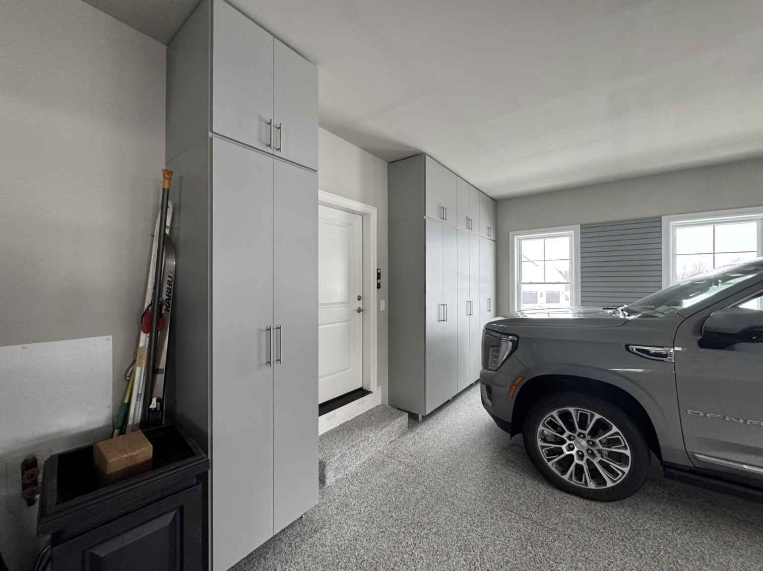 See how we designed a floor-to-ceiling garage storage system in Pittsford, NY with slim gray cabinets, slatwall, overhead storage, and a clean hidden look.
