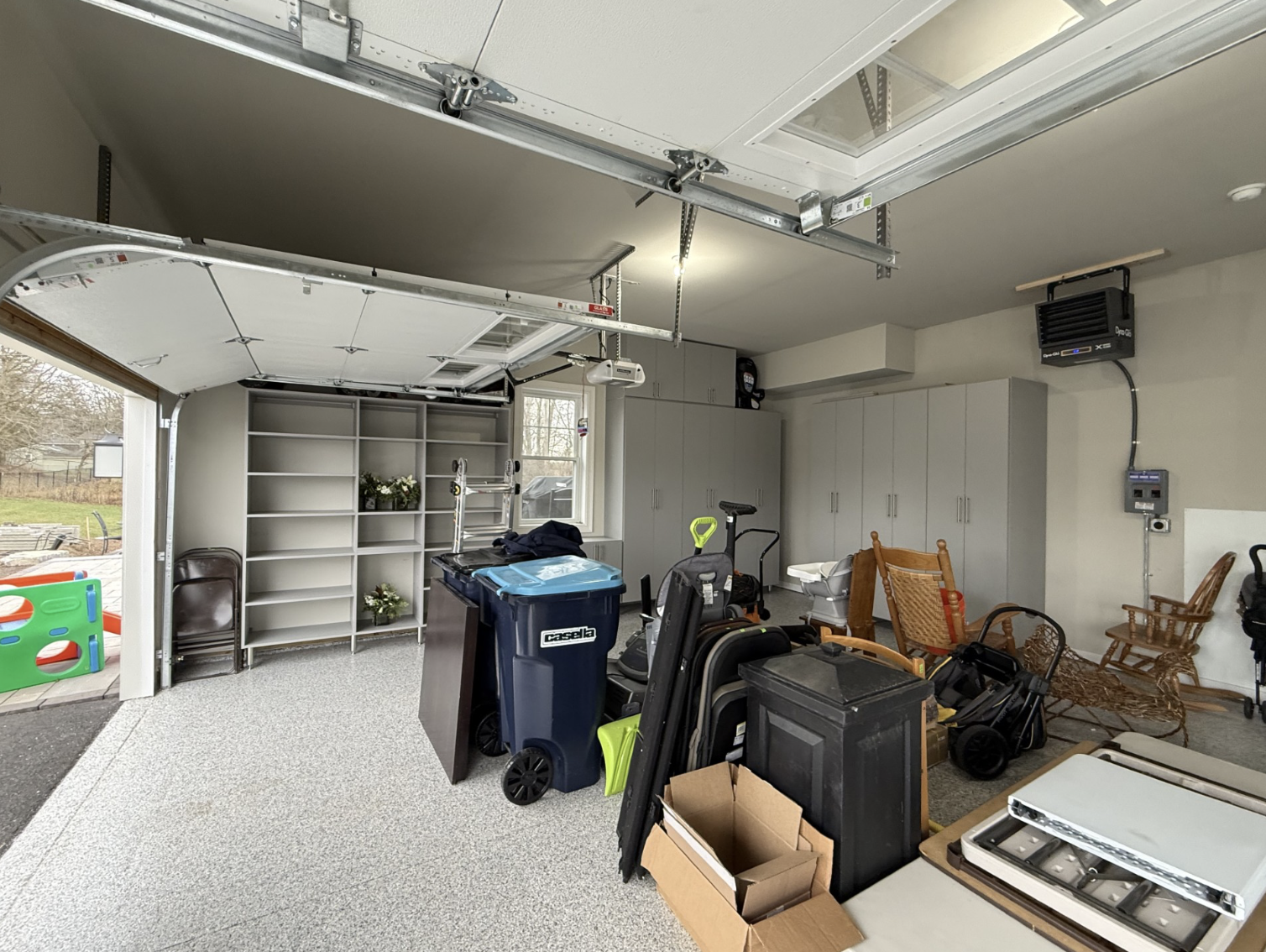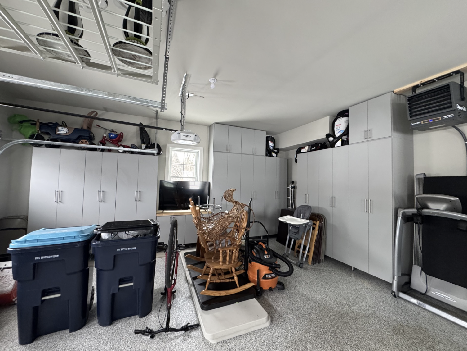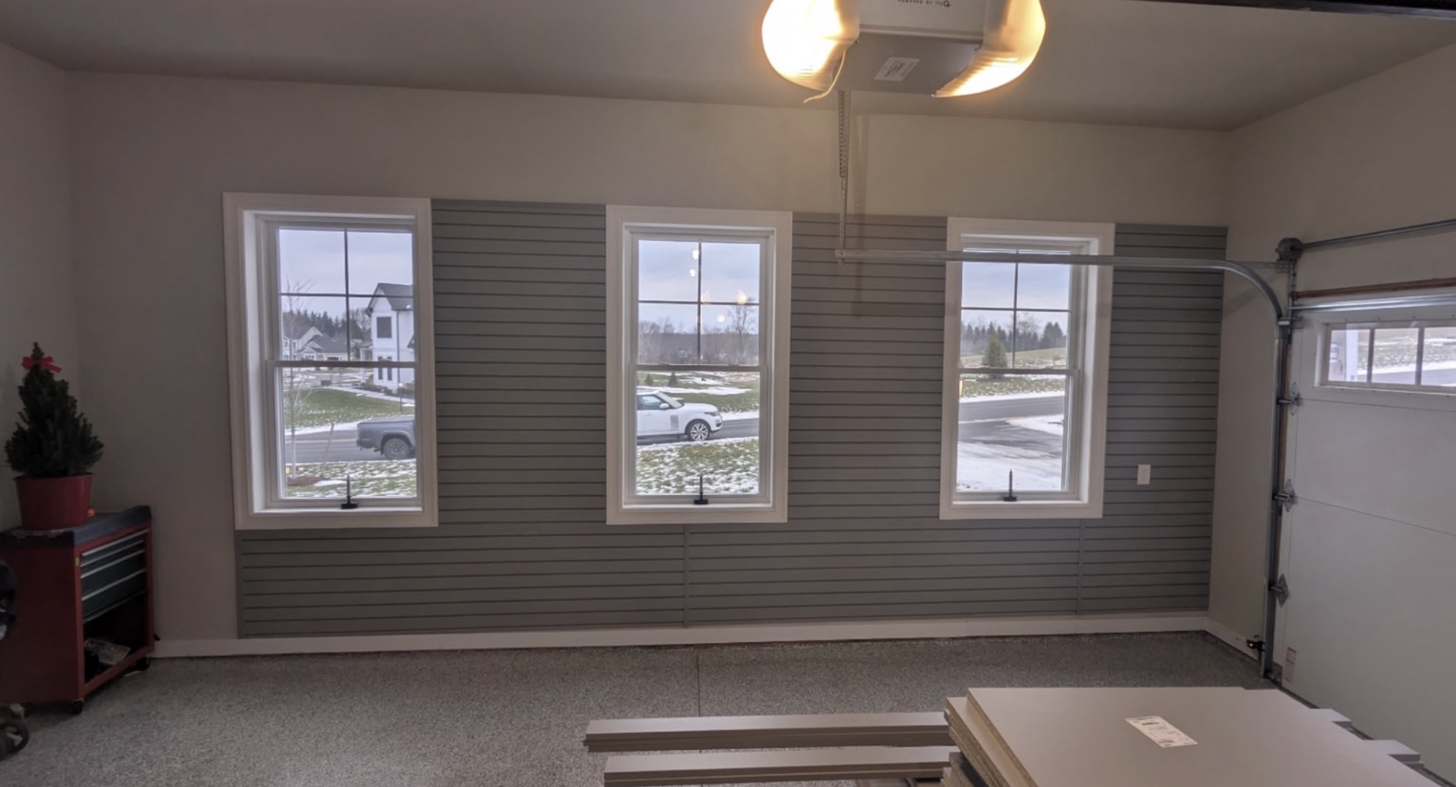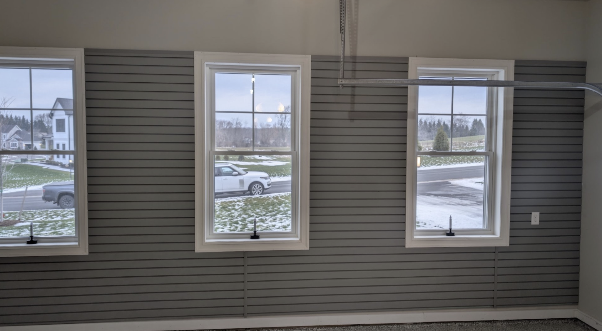 Custom gray cabinets stretch upward to conceal furniture, umbrellas, and other tall items the homeowners didn’t want stored overhead or left in plain sight. Slatwall adds flexible organization for everyday essentials, while a small workbench area offers functional workspace without overwhelming the design. An overhead rack provides additional storage capacity, all while maintaining the streamlined look they envisioned. The result is a sleek, highly functional garage in Pittsford, NY that feels polished, intentional, and built to complement a brand-new home.
