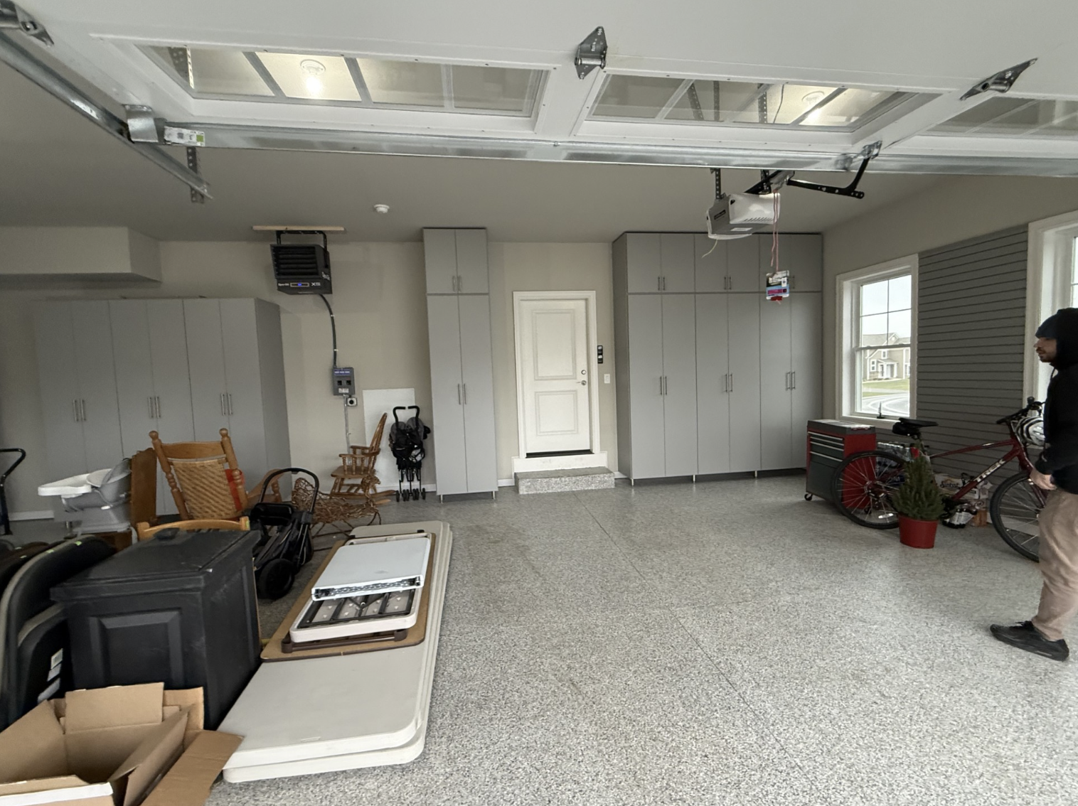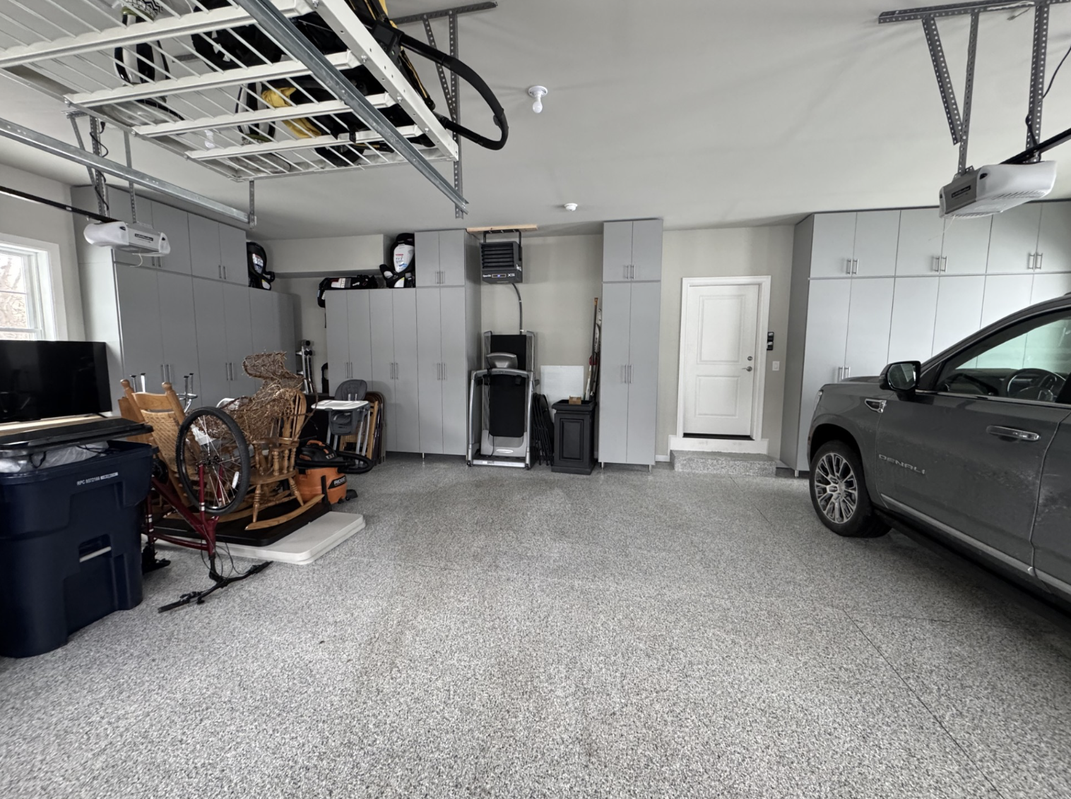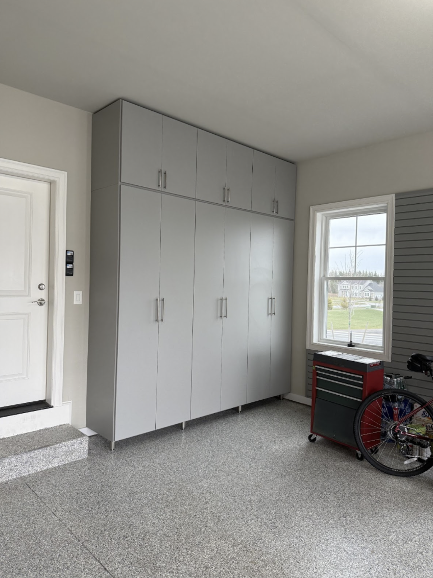 This brand-new home in Pittsford, NY came with a blank-slate garage—and Tom wanted to get it right from day one. The goal was to maximize storage from floor to ceiling while keeping everything hidden behind clean, modern cabinetry. With two large SUVs needing to fit comfortably inside, the layout had to be strategic. Slim, tall cabinets were the perfect solution, providing generous storage without crowding the parking space.